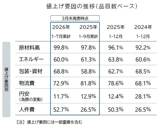 値上げ要因では、特に原材料などモノ由来の値上げが多くを占め、「原材料高」の影響を受けた値上げは99.8%となり、集計を開始した2023年以降で最多。