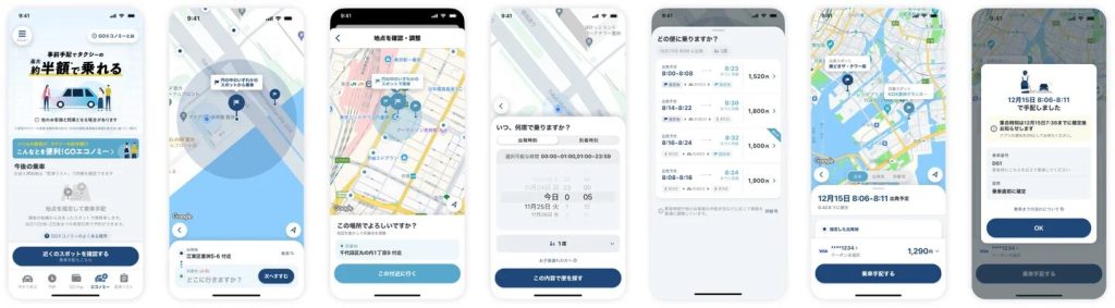 利用方法は、「GO」アプリの「エコノミー」タブから乗降スポット、乗降地、希望日時を選択し、乗車手配を行う形。利用料金は、通常のタクシーの運賃・迎車料などの約50〜90%の価格で、1席分の事前確定運賃計算方法に基づいて設定するとのことだ。