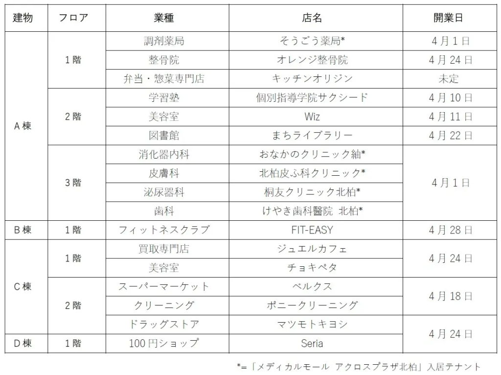 また、A棟1階および3階には各種診療科を集積した「メディカルモール アクロスプラザ北柏」を設置し、幅広い世代がワンストップで利用できる利便性を備えるとのことだ。