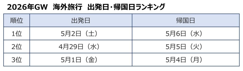 今年は日並びが良く5連休に絡めた日程が人気で、最も出発が多いのは5月2日、次いで4月29日、5月1日と続いている。