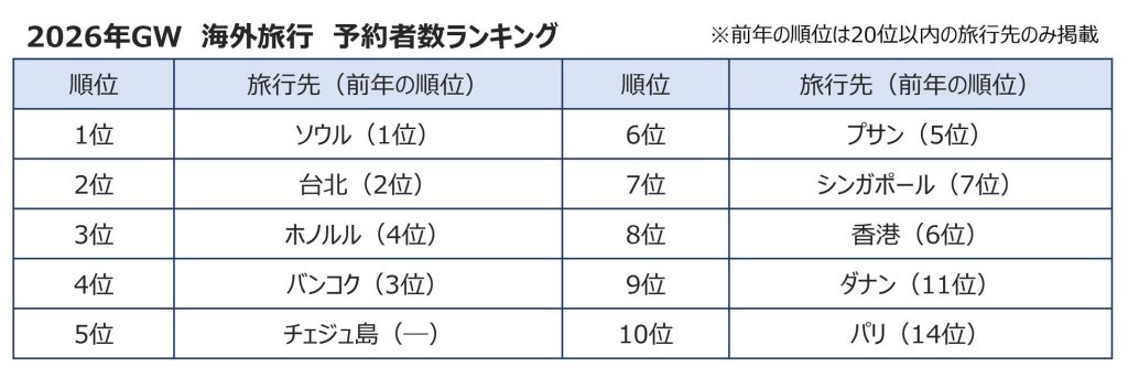 旅行先としては、近場の定番都市が上位を独占しているが、5位にはチェジュ島が急伸してランクイン。背景としては、一度に数千名規模が乗船する大型客船クルーズが複数の日程で寄港することが要因のひとつと同社は考察。