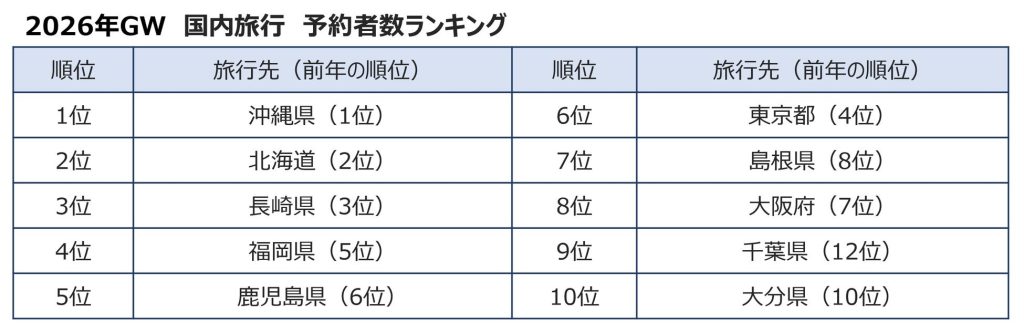 旅行先上位は例年同様の地域が並ぶ結果に。トップ10のうち、昨年、万博開催による特需があった大阪府を除く全ての都道府県が前年を超える予約者数となっており、なかでも1位になった沖縄県は前年比149.1%と国内旅行の好調さを牽引。