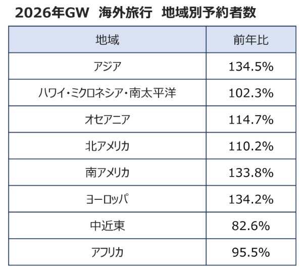 また、長距離路線も好調で、ヨーロッパ地域は前年比134.2%。一方で、中近東地域は前年割れの82.6%。前年のGW時期における中近東地域の予約者数は、全体に占める割合としては3.6%と大きなシェアではない地域ではあったものの、今後の動向は注視する必要があると同社は考察している。