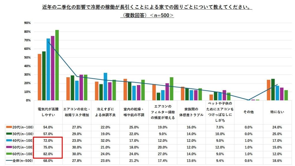 また、近年、春と秋が短く夏が長引く「二季化」の影響で冷房の稼働が長引くことによる家での困りごとを聞くと、「電気代が高騰しやすい」(68.0%)がトップに。