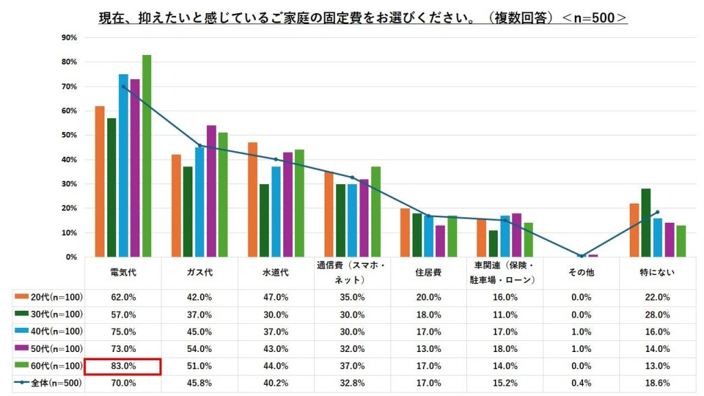 現在抑えたい固定費を聞いたところ、第1位は「電気代(70.0%)」となり、次点のガス代(45.8%)を大きく引き離した。電気代への強い不安があることがうかがえ、特に60代は83.0%が電気代を削減したいと考えており、意識が高いことがわかった。