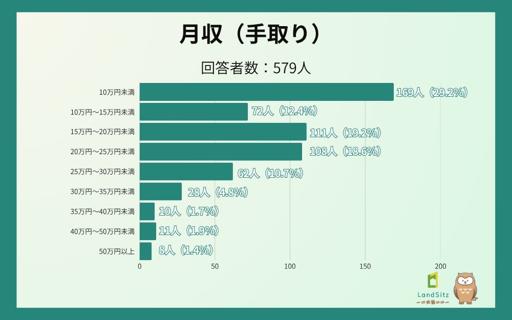 月収(手取り)は「10万円未満」が29.2%と最多で、「15万円〜20万円未満」(19.2%)、「20万円〜25万円未満」(18.6%)が続く。