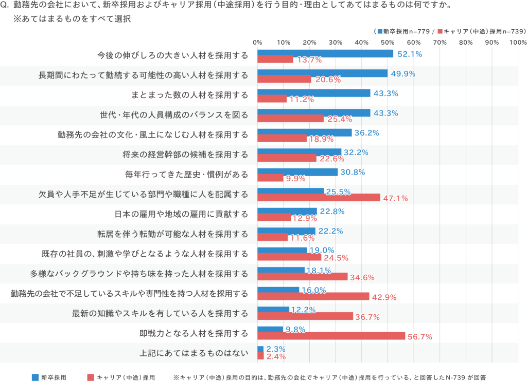 新卒採用は将来の成長や長期的な活躍を期待した人材確保の手段として位置づけられる一方、キャリア採用は即戦力や専門性の補完など、足元の人材ニーズに対応する採用として活用されていることがうかがえる結果に。