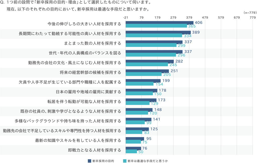 新卒採用は将来的な成長や長期的な活躍を期待した人材確保の手段として認識されている一方、専門性や即戦力を求める採用については別の採用手段が用いられる傾向がうかがえる結果となった。