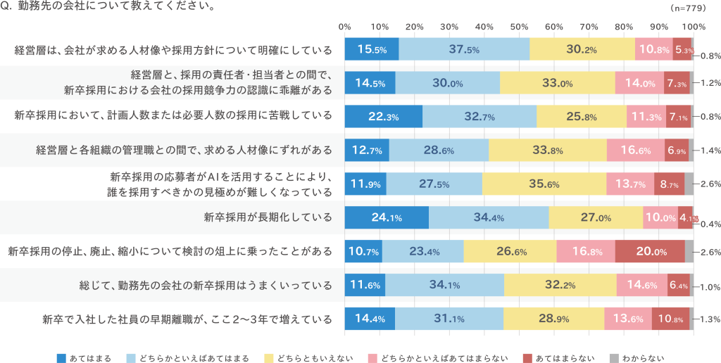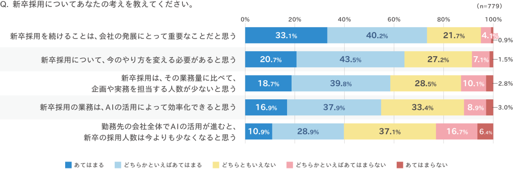 企業は新卒採用の重要性を認識しながらも、採用環境の変化に対応するため、採用方法の見直しや施策の拡充、AI活用などを進めている可能性が示唆される結果となった。