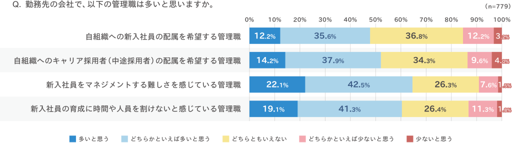 次に、勤務先企業の管理職の状況を見ると、「自組織への新入社員の配属を希望する管理職」と「キャリア採用者(キャリア採用者)の配属を希望する管理職」はいずれも5割前後。