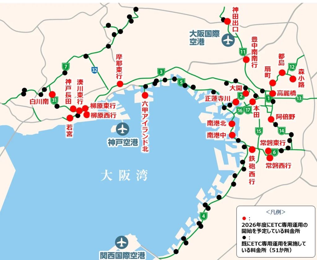 また、2027年1月から3月には、常磐東行料金所、森小路料金所、都島料金所、南港中料金所、扇町料金所、本田料金所、豊中南南行料金所、阿倍野料金所、鉄砲西行料金所、湊川東行料金所、摩耶東行料金所をETC専用化する予定という。