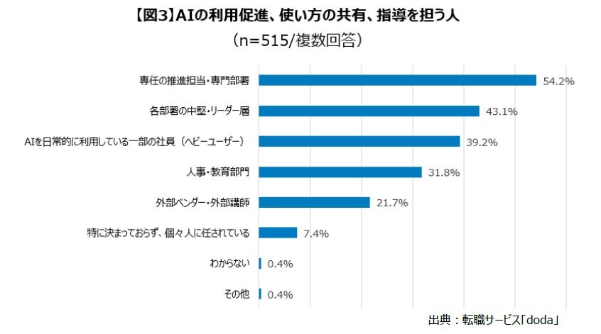 また、AIの活用促進やツールの使い方に関する共有・指導を誰が担っているか複数回答で聞いたところ、「専任の推進担当・専門部署」が54.2%で最も高くなった。