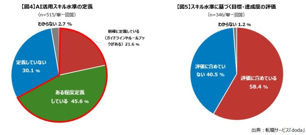 そのうち、スキル水準に基づいた行動目標や達成率などを組織や個人の評価に「含めている」企業は58.4%に上る。なお、全社横断でAIを活用している企業では、スキルを明確に定義している割合が相対的に高い傾向が見られた。