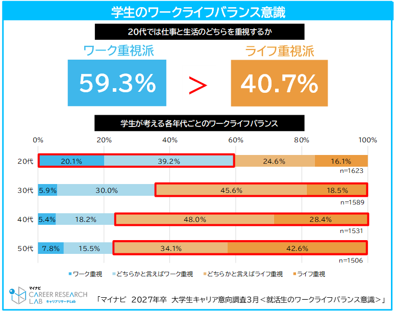 2027年卒業予定の学生に、就職後の年代ごとにおけるワークライフバランス意識を聞いたところ、20代では「ワーク重視」(※1)が59.3%で「ライフ重視(40.7%)」(※2)を18.6pt上回った。一方で、30代以降から50代までは「ライフ重視」に寄った。