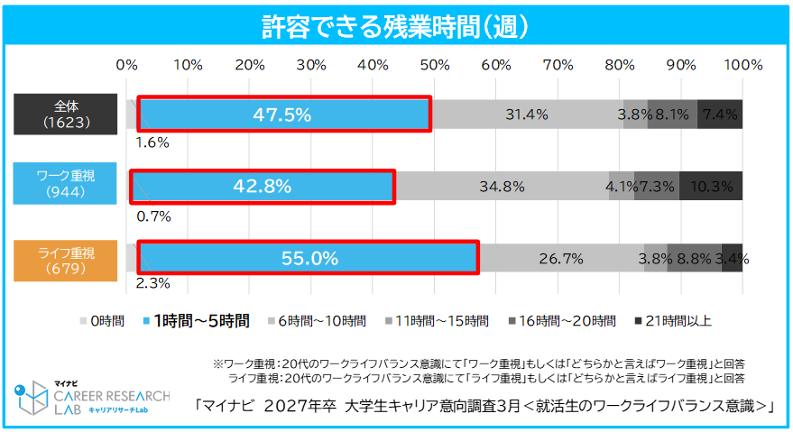 また、許容できる残業時間の上限を聞くと、最も多かったのは「週1~5時間(47.5%)」で、1日1時間以下と考えている学生が多いことがわかった。さらに、ワークライフバランス意識別に回答をみると、どちらも最多回答は「週1~5時間」となった。