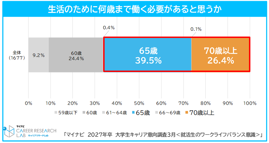 学生に「生活のために何歳まで働く必要があると思うか」を聞くと、「65歳(39.5%)」が最多で、4人に1人は「70歳以上(26.4%)」と回答。現在の学生は、再雇用後に年金受給開始年齢まで働くことを見据えている様子がうかがえる。