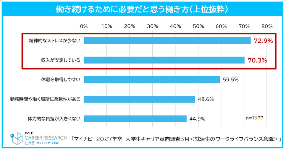 働き続けるために必要だと思う働き方を聞いたところ、「精神的なストレスが少ない(72.9%)」や「収入が安定している(70.3%)」が上位に。