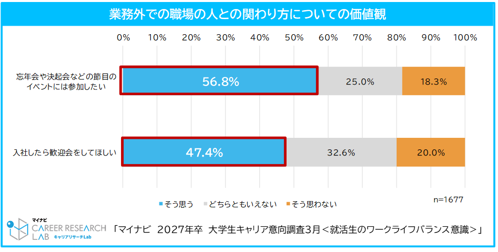 ■学生が理想とする職場の人との業務外での関わり方、「忘年会や決起会などの節目のイベントには参加したい」「入社したら歓迎会をしてほしい」