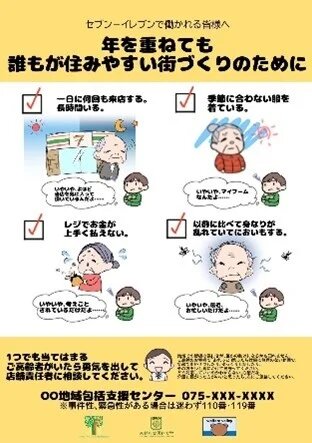 取り組み概要によると、店舗では認知症の疑いなど支援が必要な高齢者への「気づきのポイント」をまとめた従業員向けチラシをバックヤードに掲示し、日常の見守りの参考にするという。支援が必要と思われる高齢者を発見した場合は、店舗責任者から高齢サポートへ連絡し、適切な支援につなげるとのことだ。