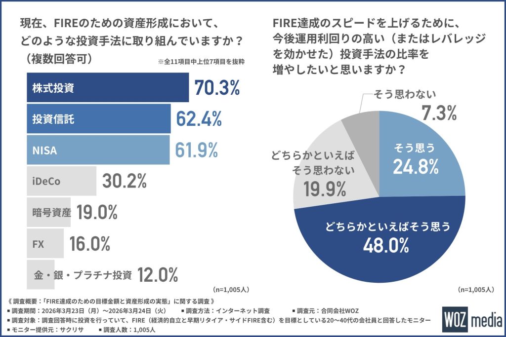 WOZは、投資を行っていて、FIRE(経済的自立と早期リタイア・サイドFIRE含む)を目標としている20〜40代の会社員を対象に、「FIRE達成のための目標金額と資産形成の実態」に関する調査を実施し、結果を公表した。