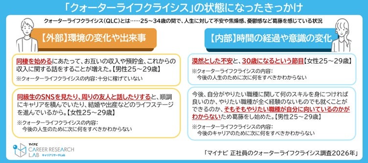 クォーターライフクライシスのきっかけを見ると、「同棲を始めたこと」など生活環境の変化や「他者との比較」など外的要因と、「30歳になるという節目」や「やりたい職種に関して何をすべきかわからない」といった内的要因の回答もみられた。