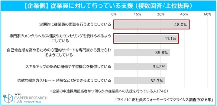 ■企業の4割以上が従業員向けの支援として「定期的な面談」を実施