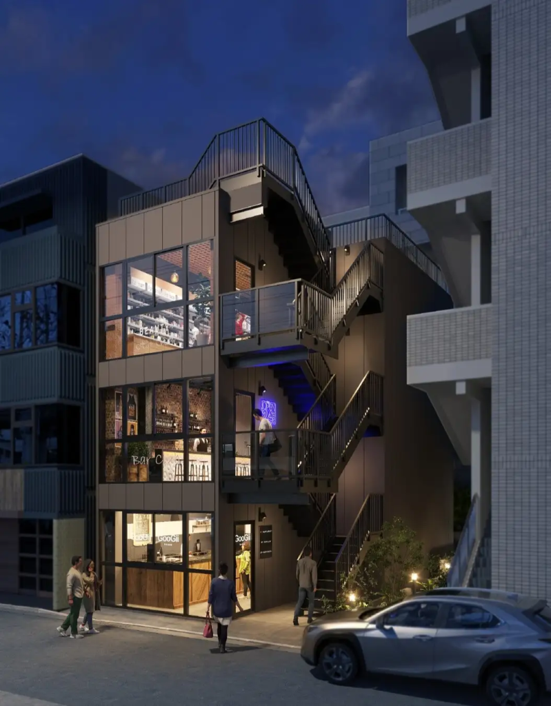同プロジェクトは、オーナーの「地域活性化につながる土地活用をしたい」という意向を受け、「フィル・パーク」を採用。外観は全面ガラス張りを特徴としており、夜間には建物内部の光が周囲を照らし、街灯のような役割を果たす設計となっている。
