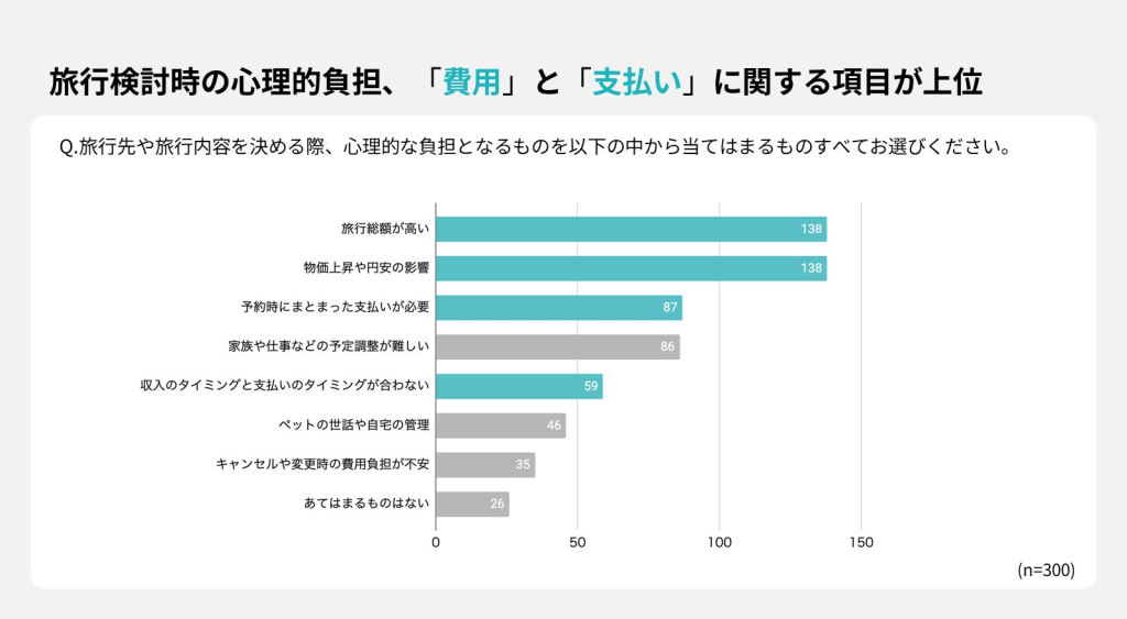 旅行検討時の心理的ハードルを聞いたところ、「旅行総額が高い」「物価上昇や円安の影響」が上位に挙げられた。また、「予約時にまとまった支払いが必要」「収入と支払いのタイミングが合わない」など、支払いに関する負担も意思決定に影響している結果に。