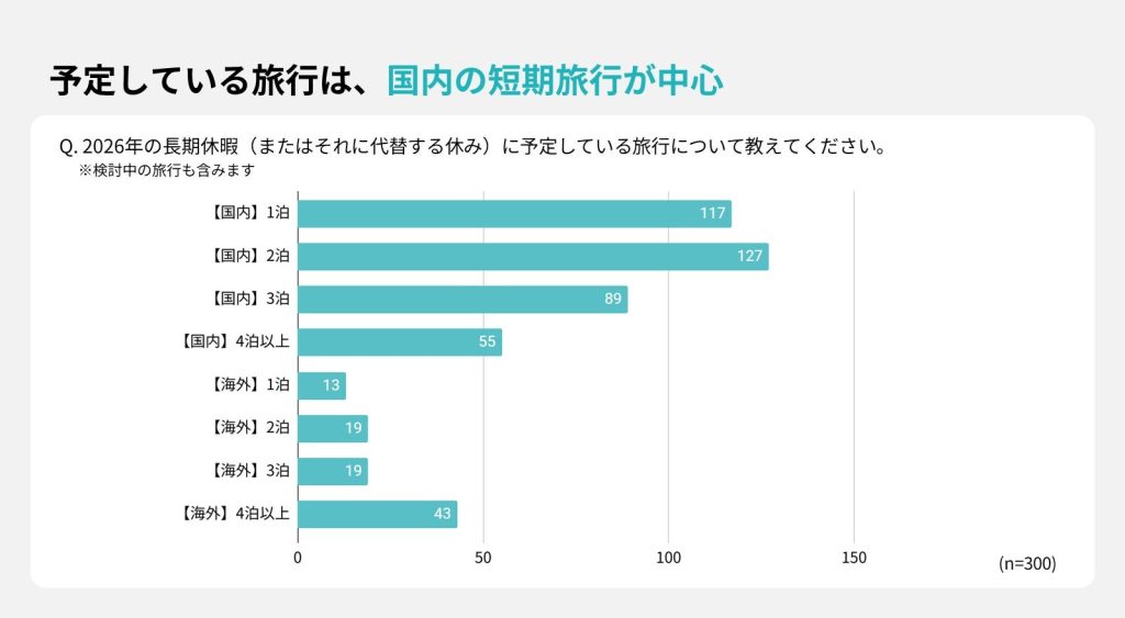 検討層の旅行内容は「国内2泊」が最多で、「国内1泊」「国内3泊」と続いた。